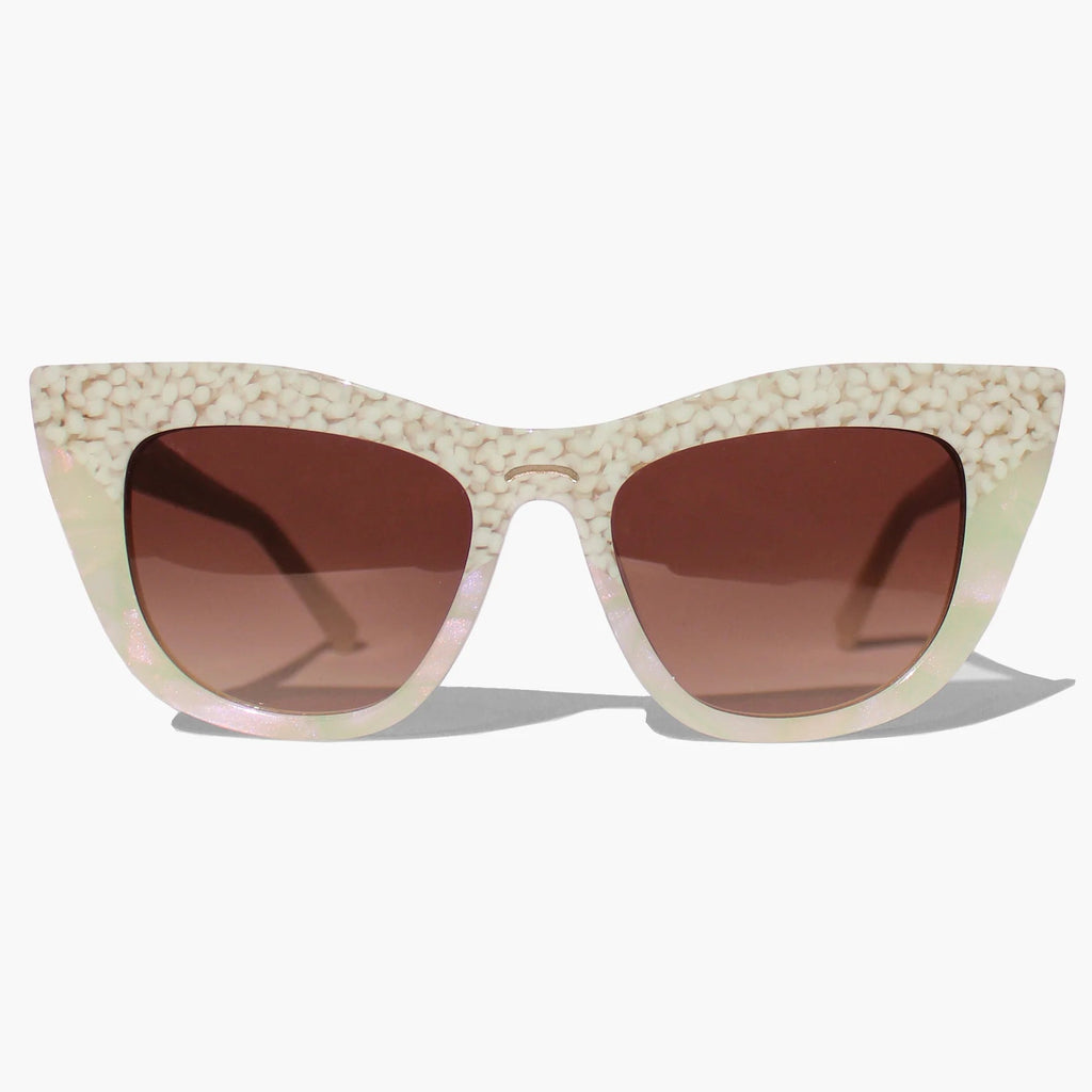 Two-tone cat-eye sunglasses in white bubble print and mother of pearl acetate.