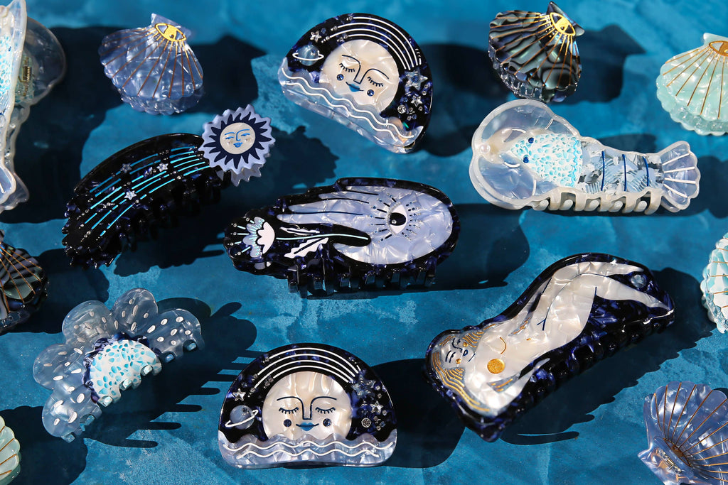 All Hair Claws and Clips are designed by Jemima Kingston in her Australian studio. They are made outside of Australia and mainly comprised of a plant based biodegradable acetate also with a mix of regular acetate, pearls, paint work and metal components.