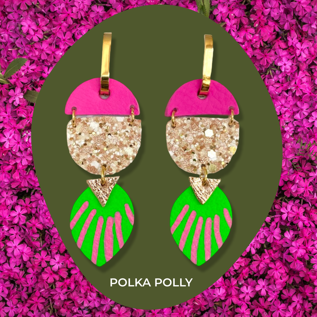 Young Love consists of hot pink, rose gold and white glitters, fluro green and metallic rose gold with hand painted detailing. Hung on gold stainless steel chunky hoops.