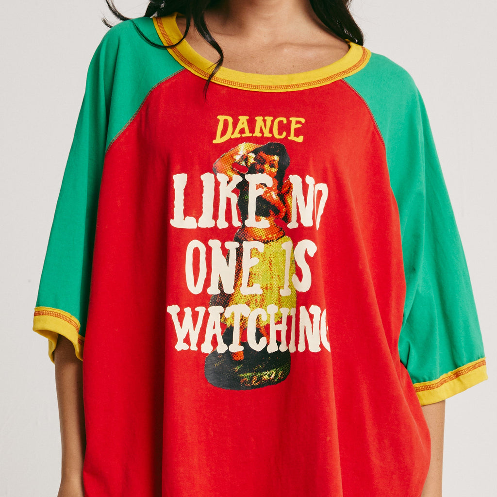 The Dance Raglan Tee brings all the retro energy and feel-good vibes your wardrobes been missing. Made from 100% cotton, it's got that perfectly oversized, worn-in fit that feels like it's lived through a thousand good times and it's ready for a thousand more.