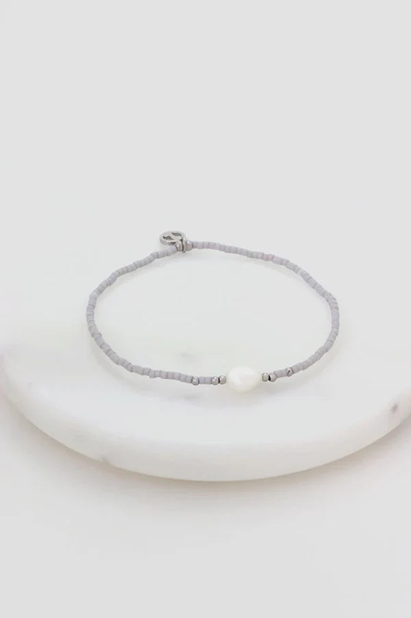 The Emma Bracelet Mist is a dainty and elegant piece, featuring soft pale grey beads beautifully centered around a stunning freshwater pearl.